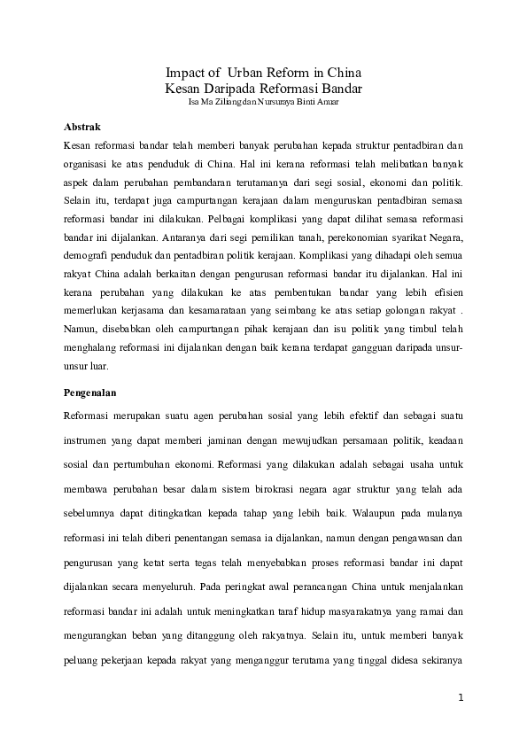 Doc Impact Of Urban Reform In China Kesan Daripada Reformasi Bandar Isa Ma Academia Edu